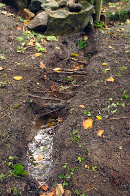 Sällan har jag längtat så efter ett årstidsbyte. Min sista arbetsinsats i höstas var en regnvattenränna rakt ut i gräsmattan, men projektet växte och jag hann inte så långt som jag önskat innan kylan slog till. Utloppet till rännan är ett markrör som är kopplat till ett stuprör som samlar regnvatten från halva taket. K vet inte om det än, men min plan är att kapa stupröret och koppla på en regntunna. När tunnan är full leds vattnet vidare till markröret. Vi har samma system på andra sidan av huset vilket fungerar utmärkt. Eftersom vi bor som vi gör med våtmark utanför tomtgränsen brukar jag nästan aldrig vattna i trädgården. Vad jag behöver vatten till är växthuset, odlingskragar och krukor nära huset. Vattnet jag försökt leda om har tidigare flödat ut över en gång med kompakt jord och efter en regnskur blir där sumpmark med stående vatten under en ganska lång tid.
